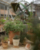 Pots of herbs and scented geraniums, emitting aromas of rose, lemon, nutmeg, and more, fill every table, interspersed with charming concrete garden statues, forming vignettes that delight every sense.